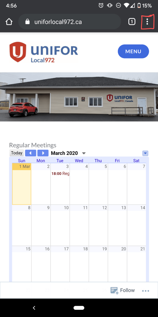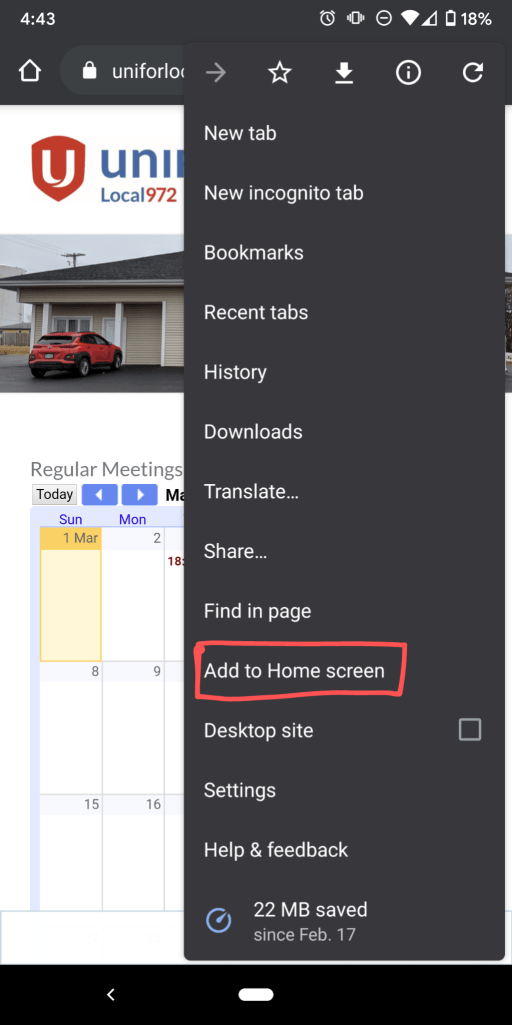 On most modern Android and iOS phone browsers, there is an ability to add a website to your home screen, for easy access without having to open your browser and type in the URL every time you’d like to visit it. Here are the steps to do this for yourself. They may vary depending on what version of the Android or iOS operating system your phone is currently running.